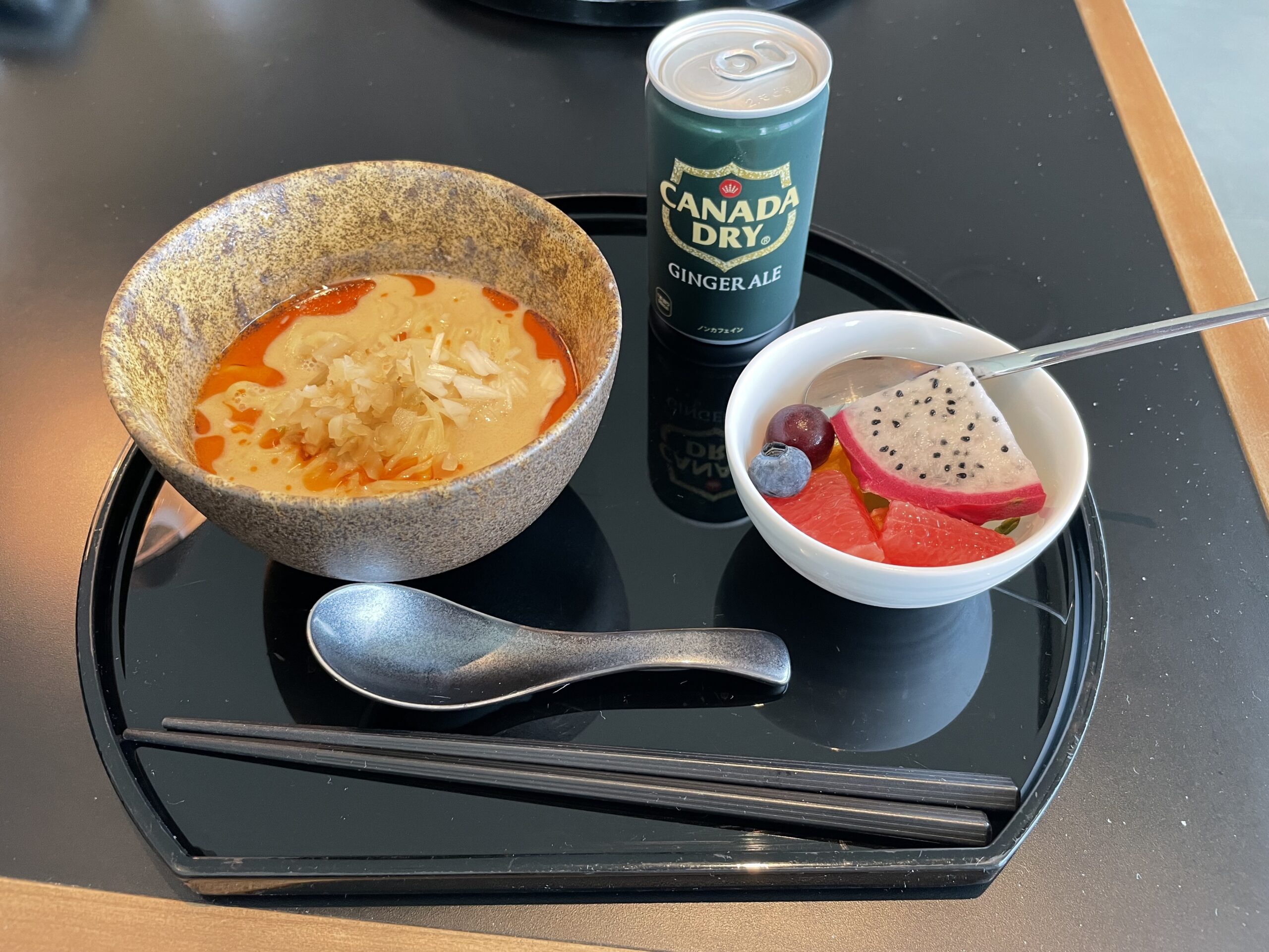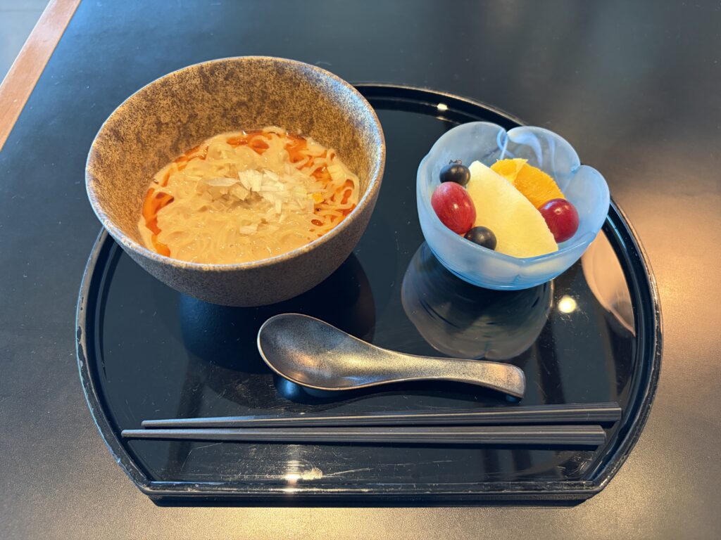 羽田空港のキャセイラウンジの売りはなんといっても「ヌードルバー」ではないでしょうか。メニュー定番の担々麺にワンタンメン、カレーライスにおかゆ、また、朝の時間は、朝食メニュー(頼みませんでしたが、フレンチトーストなどがありました)などを調理してくれます!